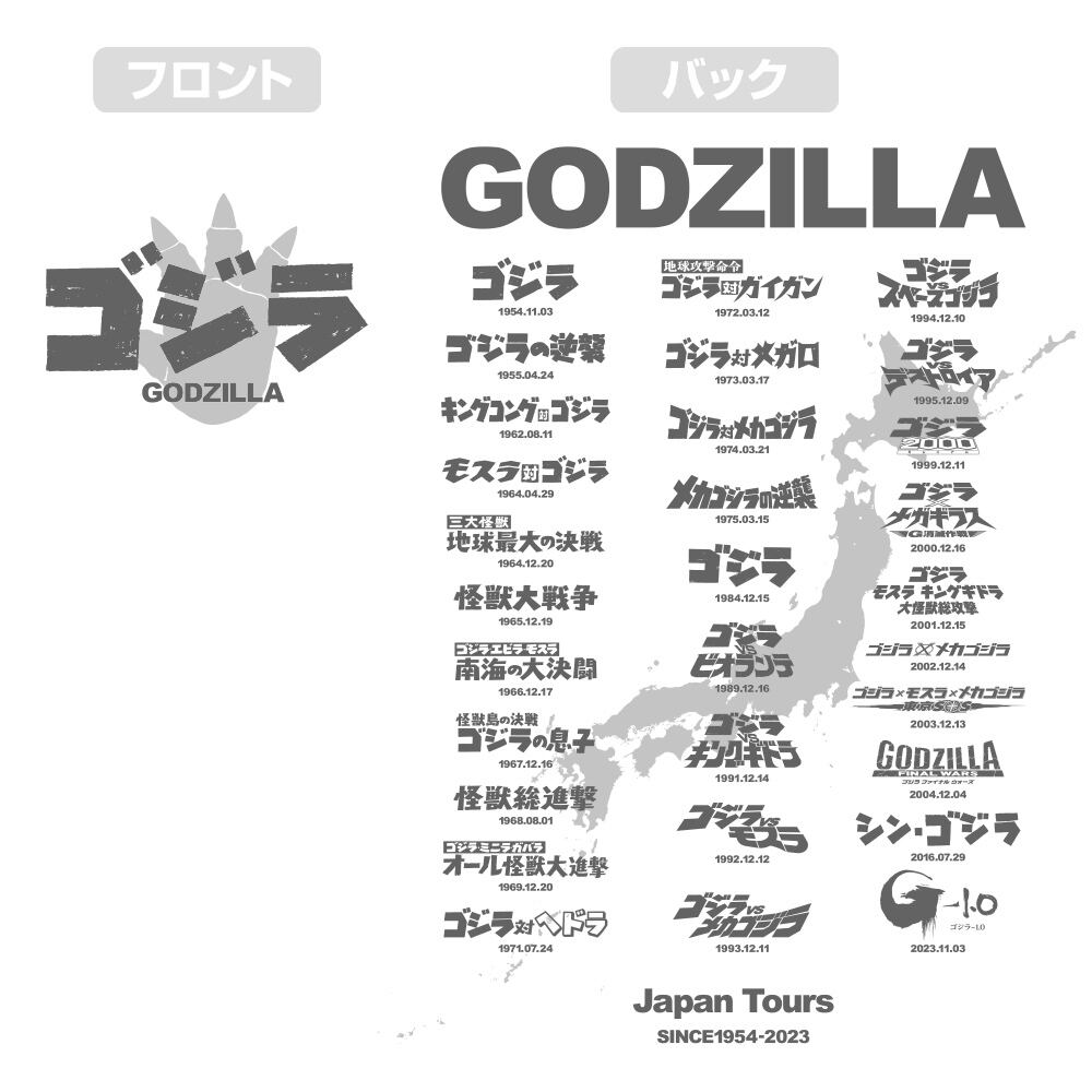 ・1954~2023年までの映画ロゴをライブツアーTシャツ風にデザイン。