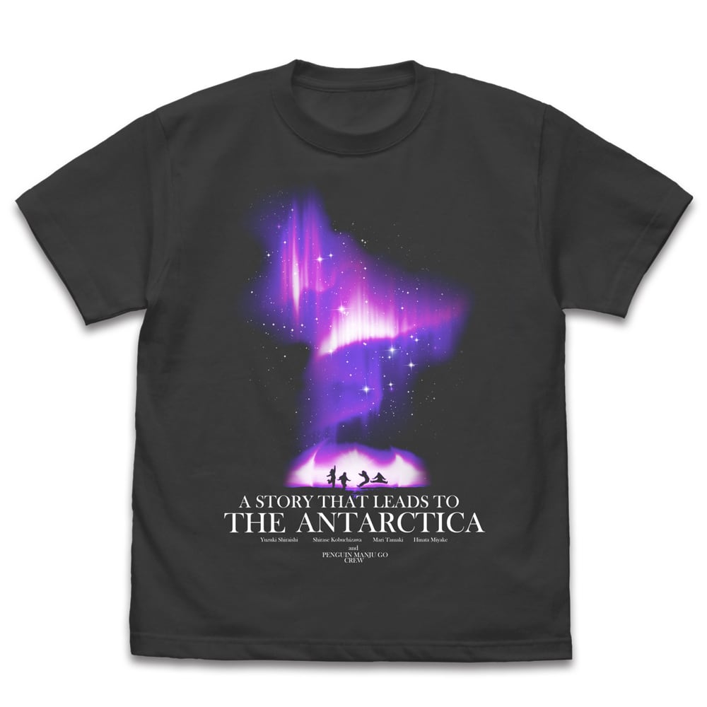 南極の空に浮かぶオーロラと4人のシルエットが印象的なTシャツ
