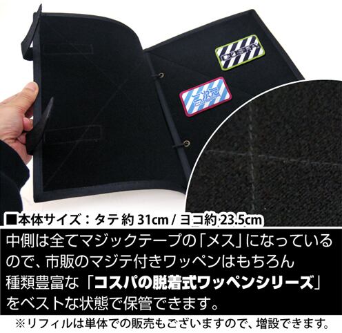表紙と後表紙の裏面と、リフィル(一枚付属)両面が、メスのマジックテープになっているので自由にワッペン(マジックテープ式オス)がコレクション可能。