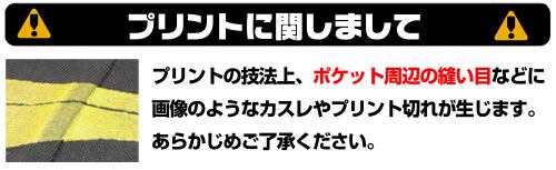 ※プリントの技法上、ポケット周辺の縫い目などにカスレやプリント切れが生じます。予めご了承ください。