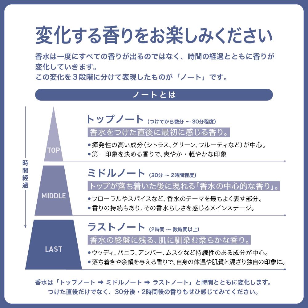 香水は「トップノート → ミドルノート → ラストノート」と時間とともに変化します。