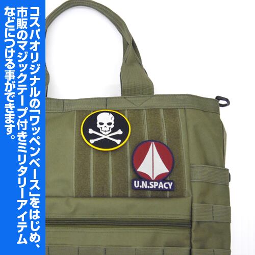 裏面にはマジックテープが付いているので簡単につけ外しができ、コスパオリジナルのワッペンベースをはじめ、マジックテープが付いた市販のミリタリーアイテムなどにつける事が可能。
