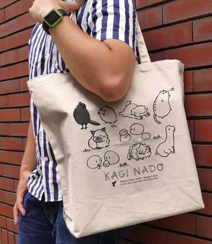 かぎなどのマスコットたちをゆるめのイラストでプリントした大容量トートバッグ