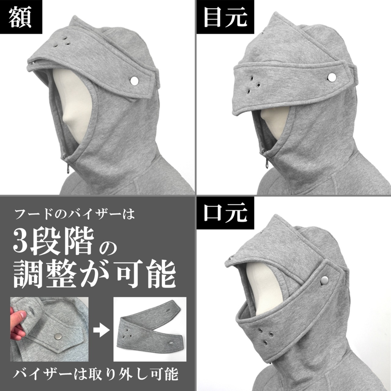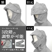・西洋の兜をイメージし設計されたフードのバイザーは額・目元・口元の三段階の位置に調整でき取り外しも可能。